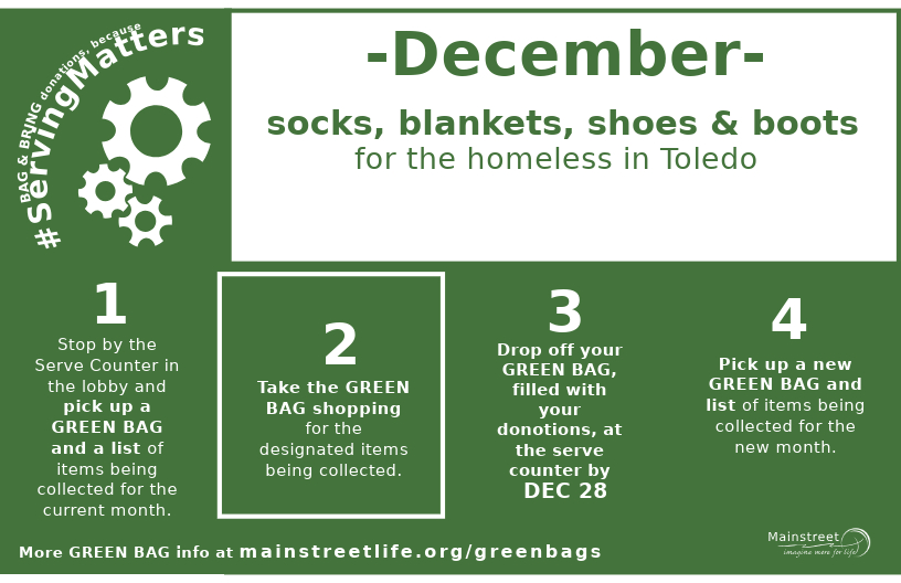 Pick up an empty GREEN Bag for December donations: Socks, blankets, shoes & boots for the unsheltered community in Toledo. The list is available at the Serve Counter and HERE. Return the filled GREEN Bags to the Serve Counter by Sunday, December 21st. Thank you for your generosity!